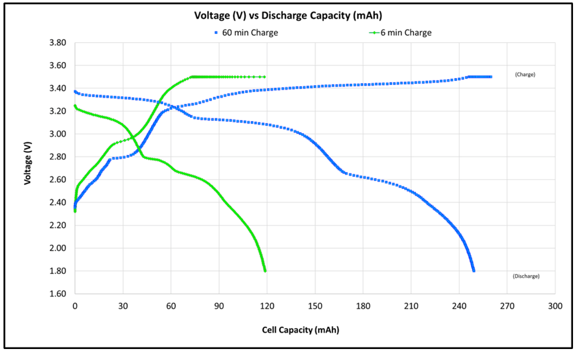 Based on that testing, the current stage of development, batteries produced by GMG and BIC had an energy density of 58 Wh/kg when charged in 1 hour and 26 Wh/kg when charged in 6 minutes. In 6-minute fast charging, the battery cells achieved 62% capacity in 3.2 minutes. The batteries had a nominal voltage of approximately 3.0 Volts and maintained performance over hundreds of cycles at 6 minute fast charging, without the significant degradation typically observed in lithium and sodium-ion batteries at such high charging rates.