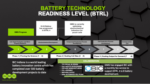 May 2023Battery Technology Readiness Level (BRTL) 2-3 reached https://graphenemg.com/gmg-announces-battery-team-and-related-updates/