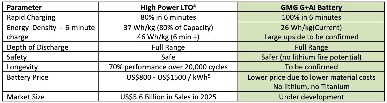 Based on its current state of development as reflected below, the GMG G+AI Battery has similar performance characteristics to those provided by High Power Lithium Titanate Oxide (“LTO”) batteries, which are sold at a premium price of up to US$1500/kWh. However, the GMG G+AI Battery can be produced at a substantially lower cost and therefore can be priced below that of LTO batteries. In 2025, sales of LTO batteries, which are used in many applications globally, totalled US$ 5.61 billion.