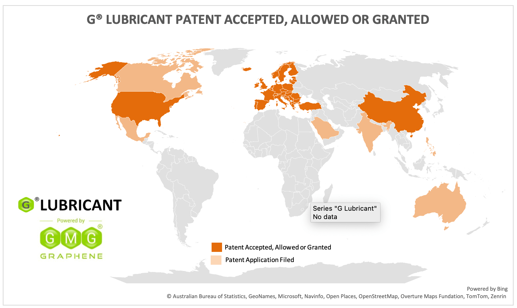 BRISBANE, QUEENSLAND, AUSTRALIA – Graphene Manufacturing Group Ltd (TSX V: GMG) (OTCQX: GMGMF) (“GMG” or the “Company”) is pleased to advise that GMG’s patent for GMG’s Graphene Engine Oil Additive, G® LUBRICANT, has now been granted for 20 years in the USA and allowed in China. This is in addition to the previously announced G® LUBRICANT patent accepted for the European region. There are various other countries around the world where this patent application is progressing as well, which are shown in Figure 1.