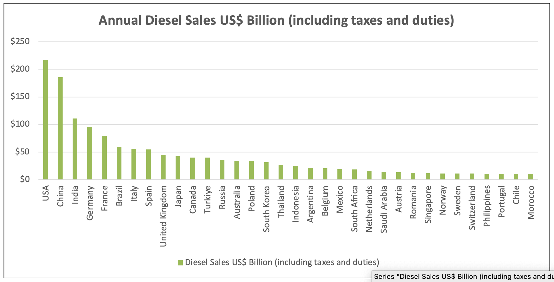 ² Using EIA diesel volumes for 2023 and www.globalpetrolprices.com diesel prices per country as of January 15th 2025