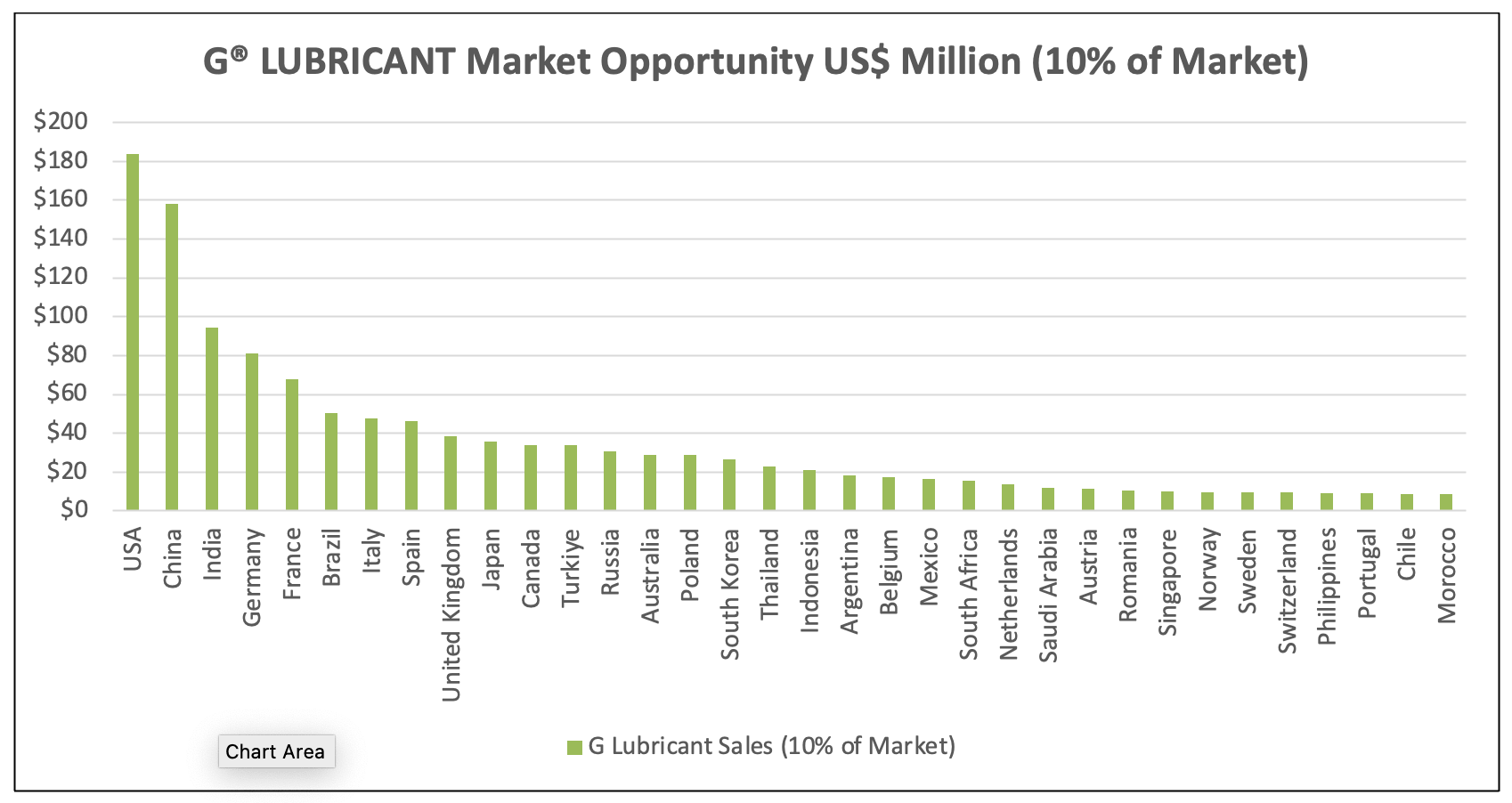 Assuming an average fuel savings of 8.4%, GMG believes that a conservative estimate of the potential market for G® LUBRICANT is 10% of the fuel savings realized by users annually. Assuming G® LUBRICANT pricing equal to 10% of the savings realized, GMG estimates that the potential global revenue for G® LUBRICANT is US$ 1.2 Billion sales per annum based on 2025 actual sales. Figure 3 shows GMG’s estimates of potential annual sales of G® LUBRICANT by country.